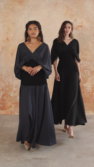 فستان باللون الاسود والكحلي مصنوع من قماش الكريب