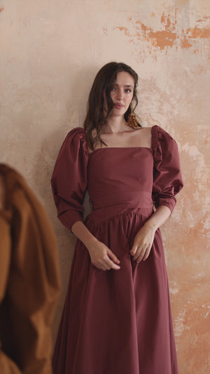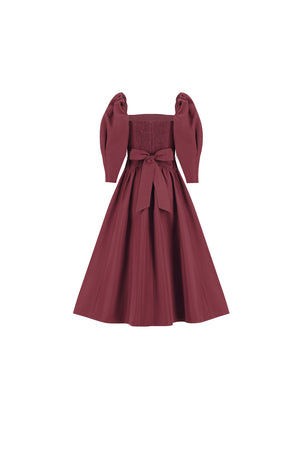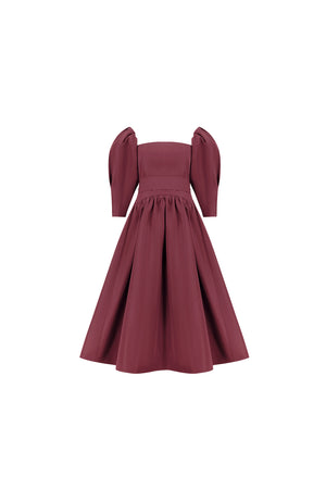 burgundy puff sleeves dress in taffeta