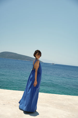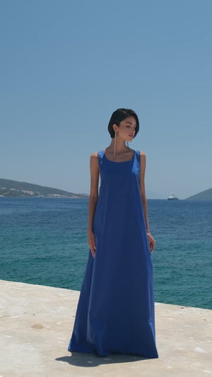 فستان بقصة مستقيمة باللون الازرق الزاهي ، مزين بلمسات أصداف
