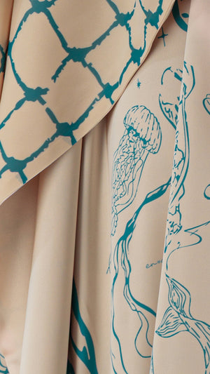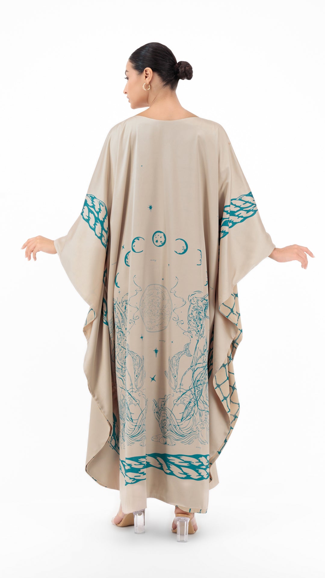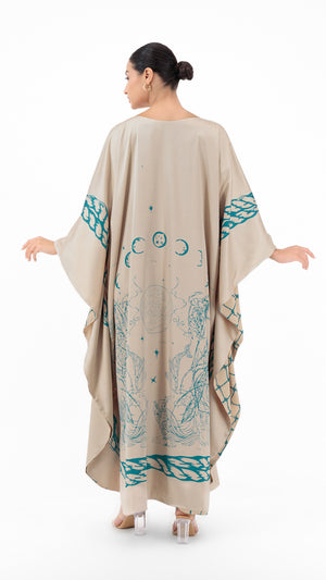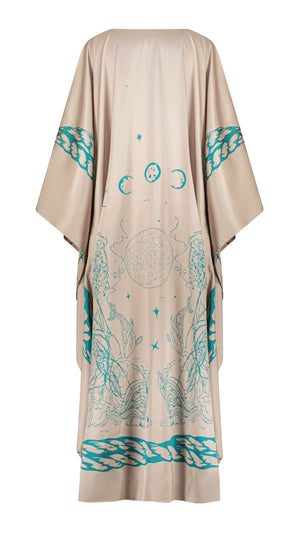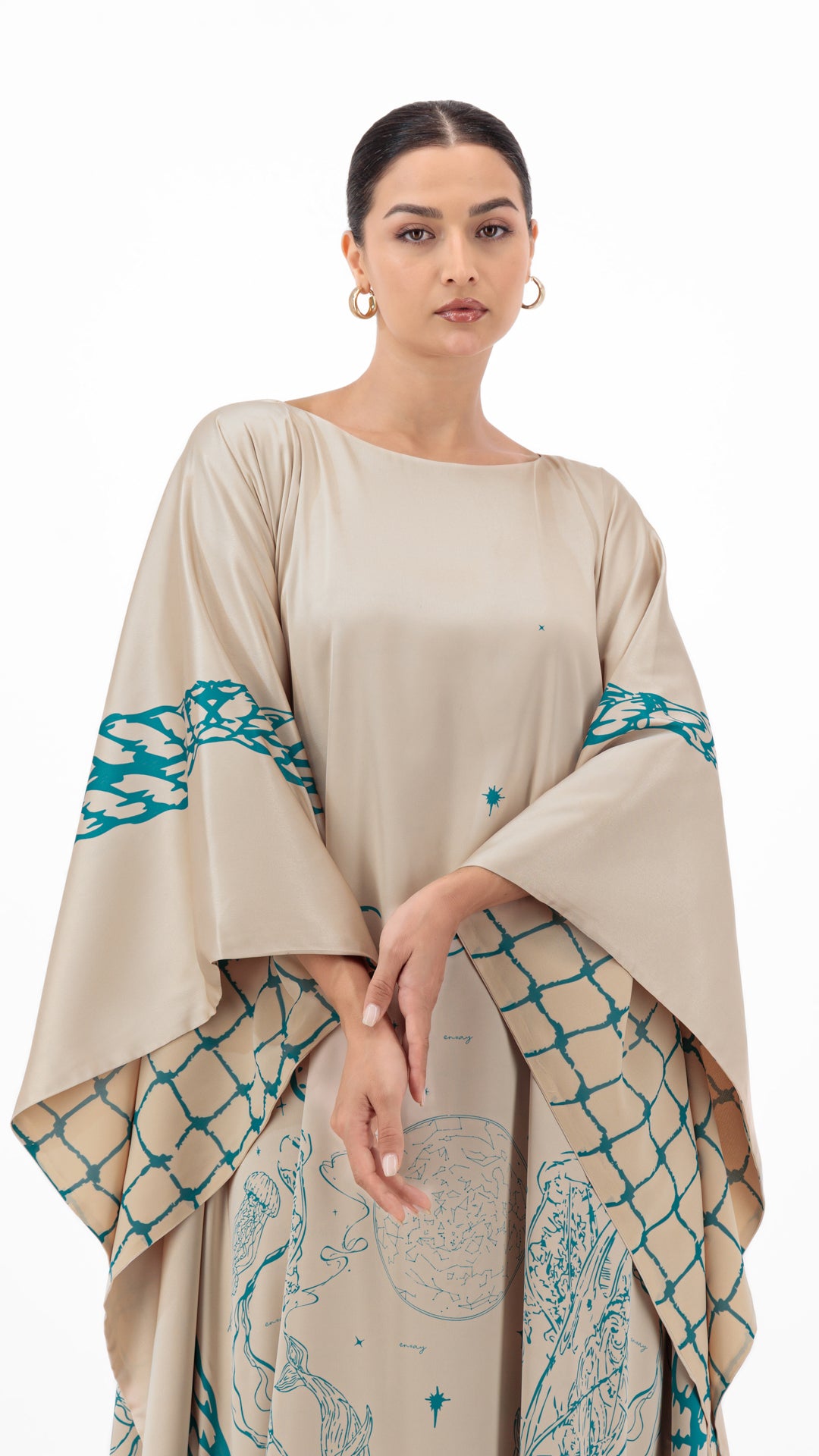 A long, loose-fitting dress crafted from soft, silky-touch fabric, featuring a relaxed silhouette in beige with unique prints.