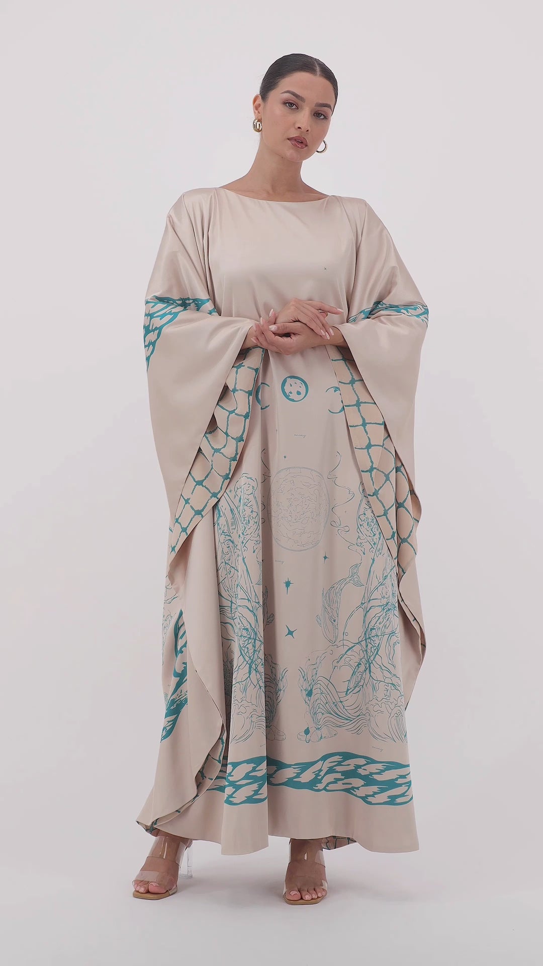 فستان طويل واسع بقصة مريحه، من قماش ناعم حريري الملمس، باللون البيج