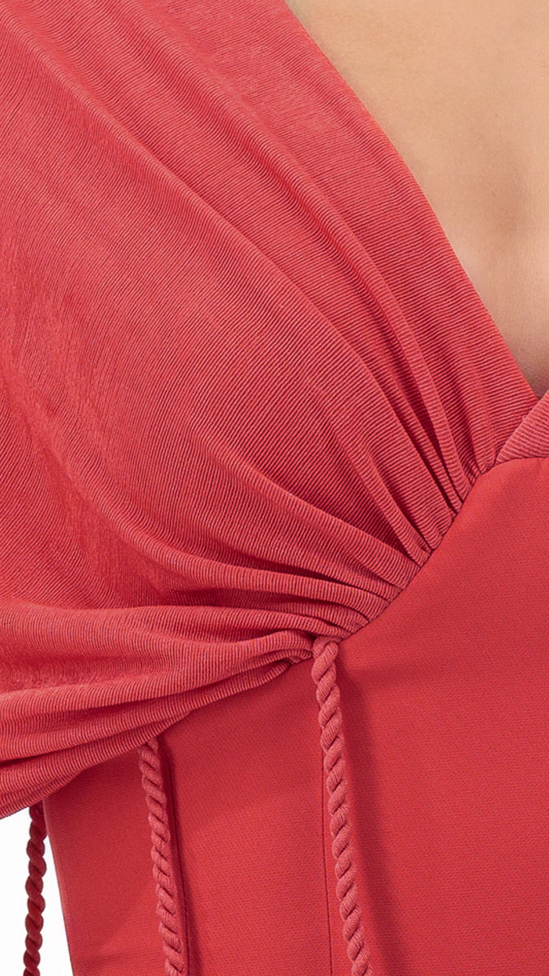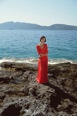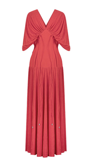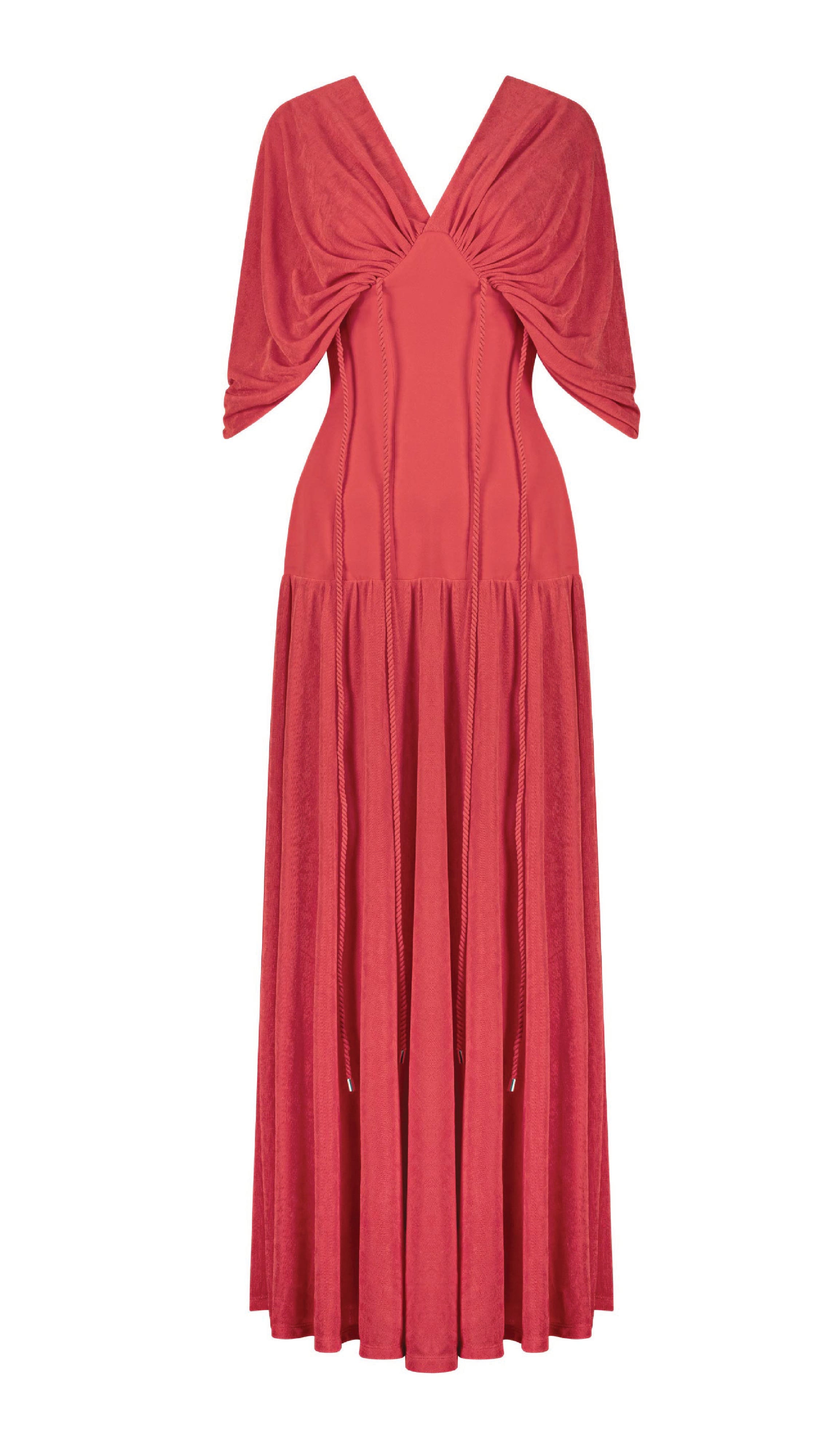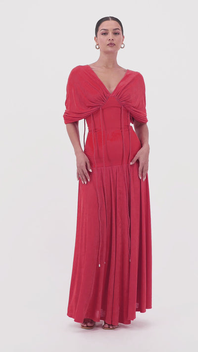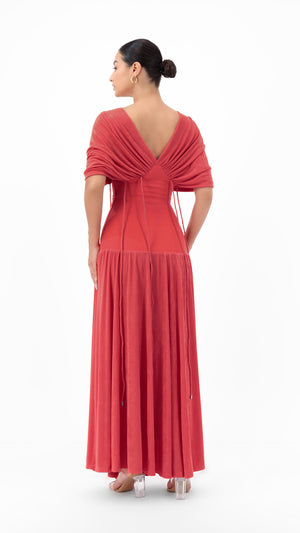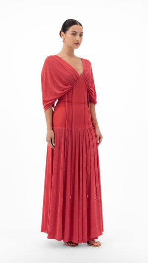 A long dress in vibrant red, featuring pleated detailing at the bodice, a wide flowing skirt, and a corset-style waist for a defined silhouette.